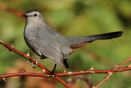 Medium-sized songbird, smaller than a robin, with a smooth gray body, black cap, and rusty-red under tail. Sometimes mimics other species in complex, jumbled song. Prefers dense shrubs and small trees in forest edges, streamside thickets, and old fields.